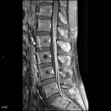 Prise de contraste leptoméningée étendue intéressant le cône médullaire et l’ensemble des racines de la queue-de-cheval.
